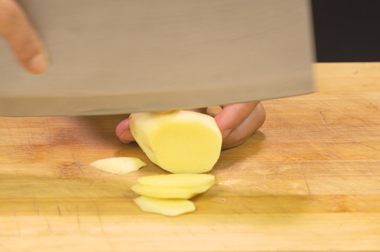 1、土豆洗净后切成块,排骨洗净后剁成块,焯水后捞出沥干水分。生姜切片备用。