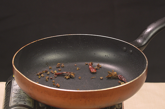 3、倒出锅中的油,放入花椒、干辣椒、八角、陈皮小火炒出香味。