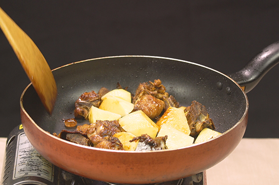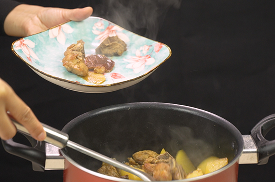 4、依次放入排骨、姜片、料酒、生抽、老抽、冰糖、十三香,翻炒均匀后放入土豆大火烧开。
