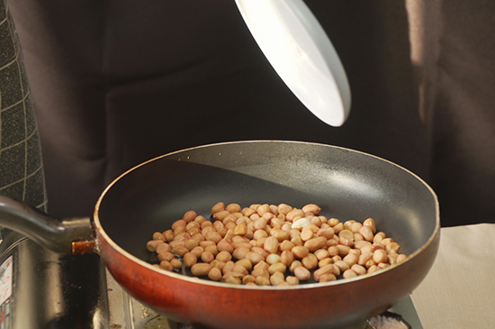 3、起锅烧油,油热后放入花生炒出红皮有香味。