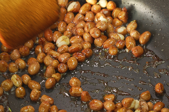 起锅烧油放入花生炒出红皮有香味后,往锅内倒入调好的料汁炒匀,美味的炝拌花生米就完成了。