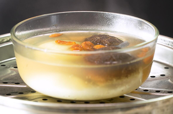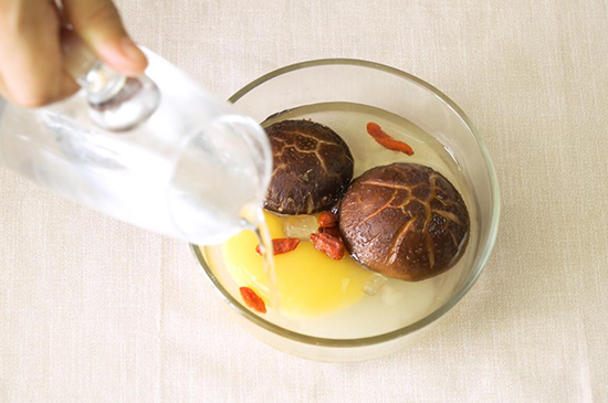 适量枸杞、冰糖和泡发的香菇倒入装有鹅蛋的碗内,沿着碗边缘倒入适量温水后,用保鲜膜盖好碗,同时用牙签在保鲜膜上面扎几个小洞,最后放入蒸锅内离水蒸制15分钟左右,一份美味的香菇鹅蛋甜汤就完成了。
