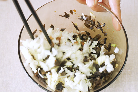 4、切好的大白菜与木耳放入肉馅内,再次搅拌均匀后,一份鲜香的白菜猪肉饺子馅就做好了。