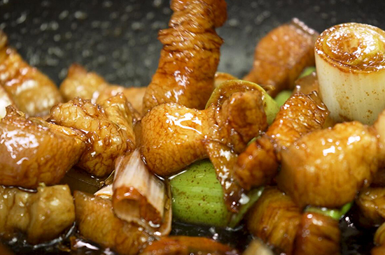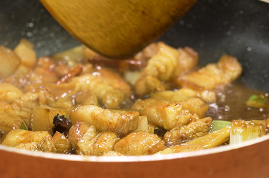 起锅烧油放入冰糖熬煮成焦红色后,放入煮好的五花肉翻炒上色,再放入料酒、八角老抽等调料各翻炒30秒。之后加水煮沸,小火慢炖30分钟,再转中火收汁至1/4或1/5关火盖锅焖5分钟,最后撒上葱花和白芝麻,一份美味的红烧五花肉就完成了。