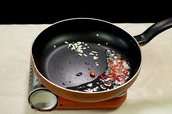 2、小米椒切成辣椒圈,大蒜切成蒜末。起锅烧油,油热后先放蒜末,再放小米椒炒出香味。