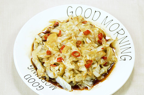 4、再依次放入盐、生抽、蚝油、老抽翻炒均匀,一份美味可口的包菜就做好了。