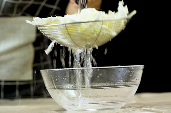 1、包菜洗净后切成丝,用盐水浸泡10分钟左右,再冲洗干净并沥干水分。
