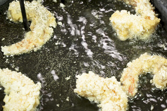 3、腌制好的虾依次沾上淀粉、鸡蛋液、面包糠后起锅烧油,把虾放入锅内炸成金黄色。