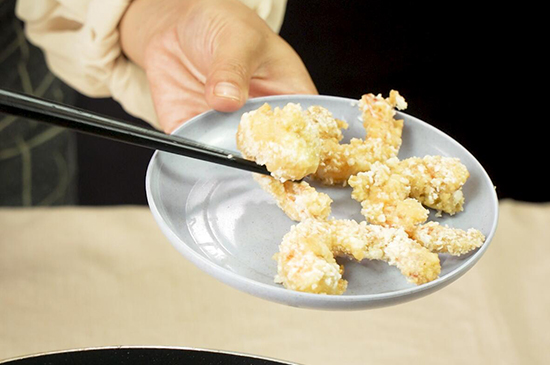 处理好的虾与料酒、胡椒粉、盐腌制1分钟后,依次裹上淀粉、鸡蛋液和面包糠,再放入油锅内炸成金黄色。最后将炸好的虾捞出装盘,一份美味的黄金蝴蝶虾就完成了。