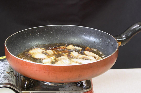 2、起锅烧油,油热后把腌好的鱼块放入煎至两面金黄,再放入姜片炒出香味。