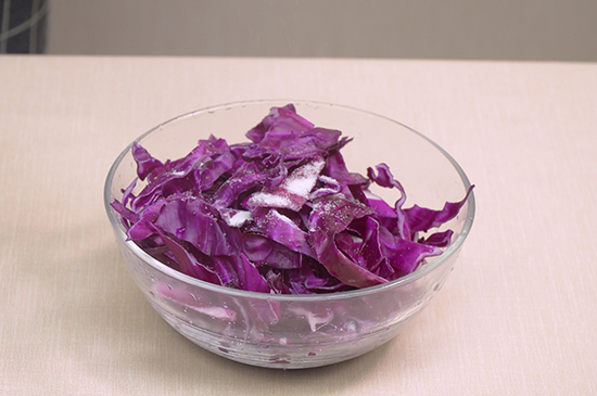 用盐、五香粉、大蒜和食用油与紫甘蓝丝腌制5分钟后,将腌制好的紫甘蓝丝放入油锅内翻炒1分钟左右。紫甘蓝丝翻炒变软后,加入适量米醋搅拌均匀进行调味,就可以做出美味的清炒紫甘蓝。
