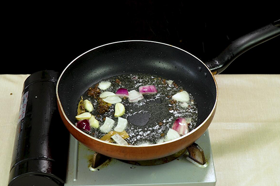 3、起锅烧油,油热后放入大蒜、八角、香叶、花椒炒出香味,再放入洋葱煸炒几次。