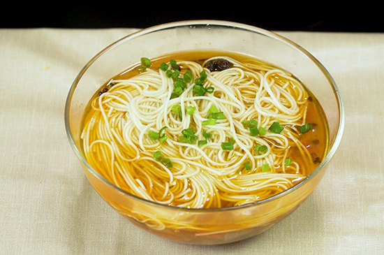 6、最后将煮熟的面条盛入装有汤汁的碗内,撒上适量葱花后,一份美味的麻辣肉丝面就做好了。
