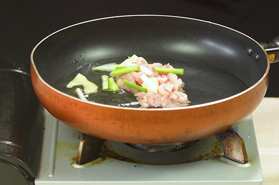2、将肉丝放入有水的锅中,依次放入料酒、姜片、葱段,煮沸后撇去浮沫。