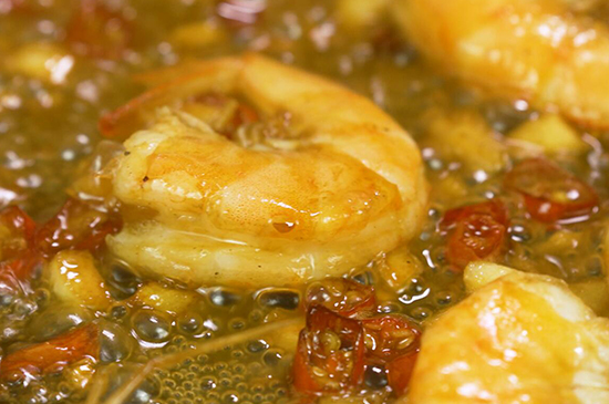 3、把基围虾放入翻炒直至全部变红,再转中火翻炒。