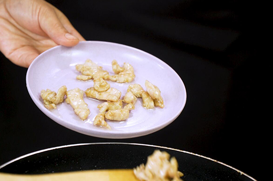3、起锅烧油,油热后放入腌好的肉片大火爆炒至全部变色,再捞出装盘备用。