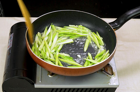 4、锅内留底油,放入蒜末炒出香味后,倒入芦笋翻炒均匀,再加盐调味翻炒至断生。