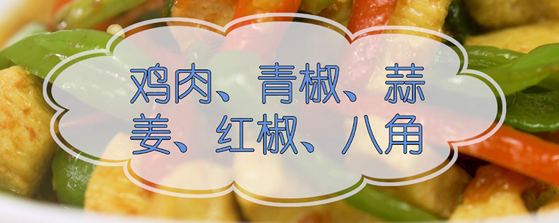 准备食材:鸡肉、青椒、蒜、姜、红椒、八角、豆蔻、西红柿、盐、食用油。