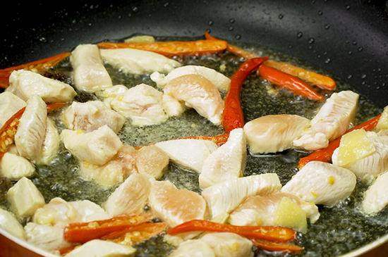 2、起锅烧油,油热后放入红椒、姜片、八角、豆蔻炒出香味后,放入鸡肉翻炒出水分,再加入适量盐和生抽继续翻炒。