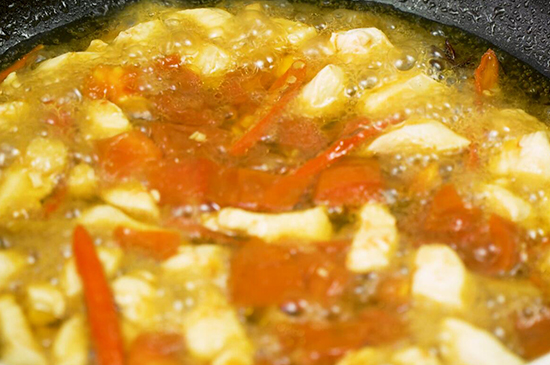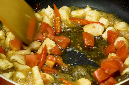 3、翻炒至鸡块出油后,倒入切好的西红柿丁翻炒均匀。