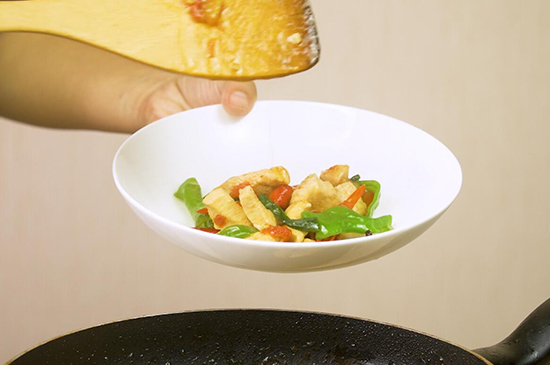 5、收汁期间加入青椒、葱段继续翻炒,直到青椒炒至断生、汤汁剩1/3时,就可以起锅装盘,一份美味的红烧鸡肉就做好了。