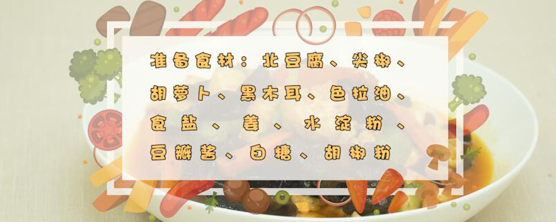 准备食材:北豆腐、尖椒、胡萝卜、黑木耳、色拉油、食盐、姜、水淀粉、豆瓣酱、白糖、胡椒粉。