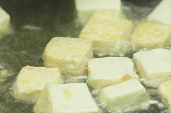 2、起锅烧油,油热后放入切好的北豆腐块煎至两面金黄,再盛出装盘备用。