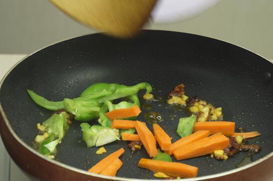 3、锅内留少许底油,倒入豆瓣酱炒出红油后,加入姜末炒出香味,再放入切好的尖椒、胡萝卜和黑木耳略微翻炒。
