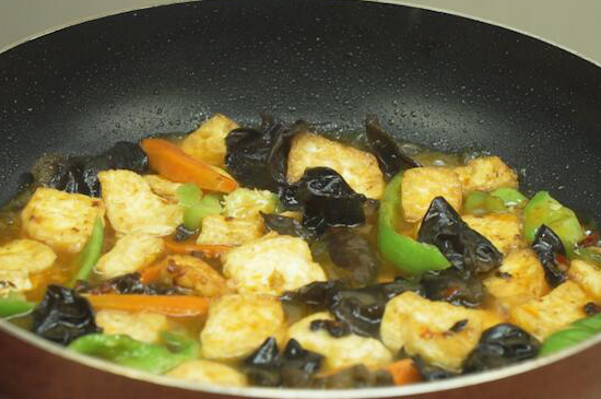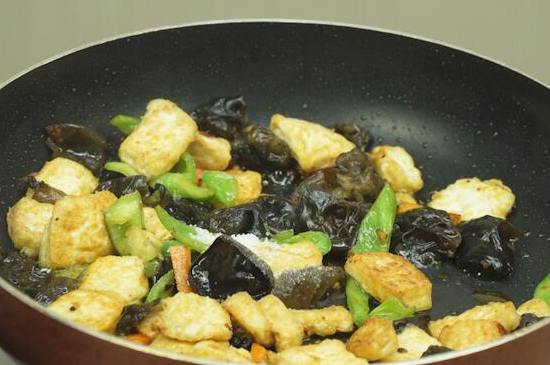 起锅烧油翻入豆腐块煎至两面金黄,再盛出备用。往锅内依次放入豆瓣酱、姜末以及切好的尖椒、胡萝卜和黑木耳翻炒后,加入煎好的豆腐块,撒入食盐和白糖并加水煮3分钟。最后倒入水淀粉,撒上胡椒粉大火收汁,就可以做成美味的家常豆腐。