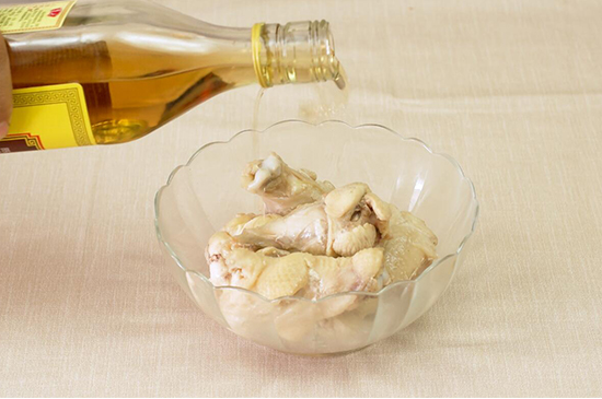 2、焯水的鸡腿捞出用冷水冲洗干净,再倒入料酒腌制20分钟左右。
