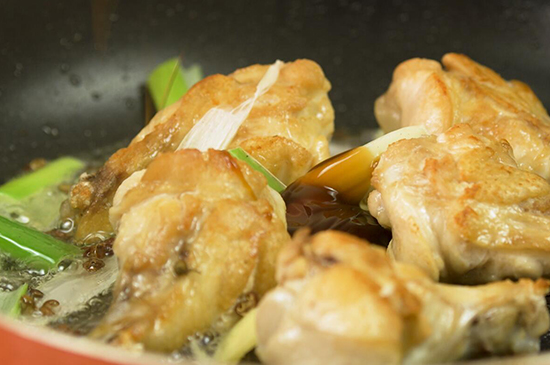3、起锅烧油,油热后倒入腌制好的鸡腿炸至金黄色后,依次倒入葱、姜、花椒、蚝油、生抽、老抽翻炒均匀。