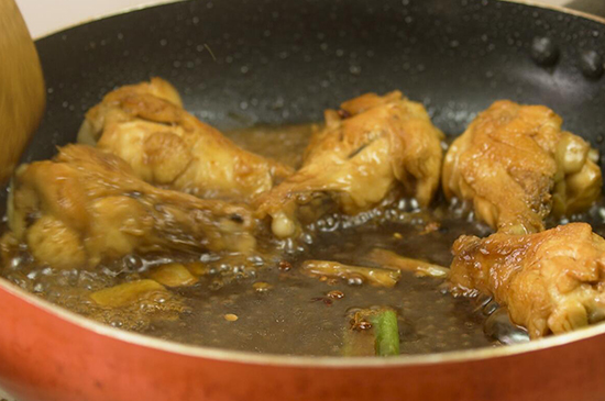 4、鸡腿完全上色后,往锅内倒入适量可乐,再调入食盐和鸡精大火收汁至完全收干,期间不断翻动,避免糊锅。
