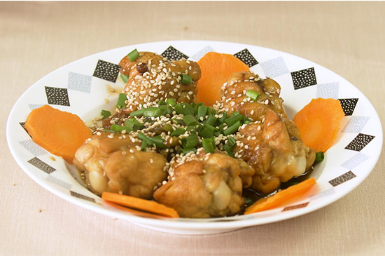 5、最后将烧好的鸡腿起锅装盘,撒上葱花和芝麻,放上胡萝卜片后,即可做成美味的可乐鸡腿。