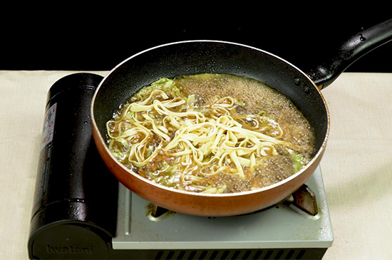 3、青菜炒出香味后加水烧开,再加入切好的千张丝和适量盐,用锅铲略微搅拌均匀。