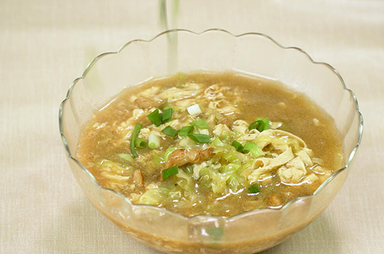起锅烧油放入肉丝翻炒1分钟,再放入酱油和青菜翻炒出香味,之后加水烧开,放入千张丝和盐搅拌均匀。最后等锅内再次烧开后,加入调至好的生粉水和蛋液搅拌烧开,倒入盘内撒上葱花和香油,一份美味的胡辣汤就做好了。