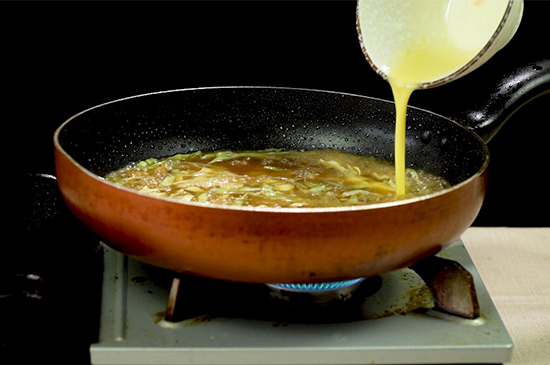 4、锅内再次烧开后加入调至好的生粉水搅拌至浓稠状,之后加入蛋液搅拌烧开。