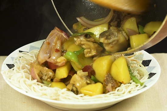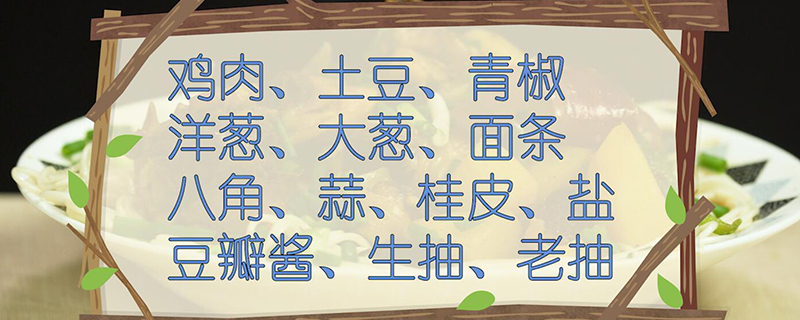 起锅烧油放入姜、蒜、八角、桂皮和豆瓣酱炒出香味后,放入鸡肉炒至7分熟,再加入老抽和生抽上色,倒入清水煮开,放入土豆小火煮15分钟后,再放入盐、青椒、洋葱、大葱炒至断生,最后大火收汁,把所有食材放入装有面条的盘内,撒上葱花即可。