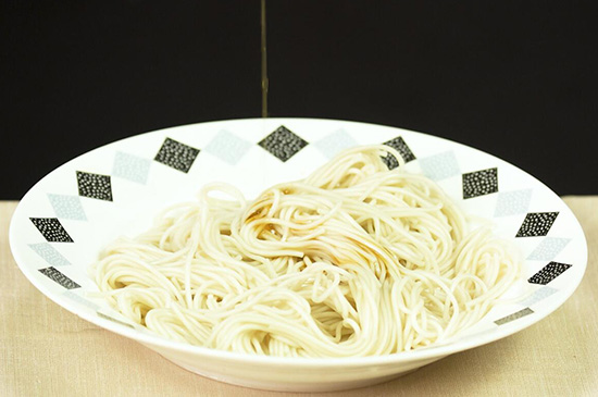 2、起锅烧热水,面条放入焯熟后捞出过一遍凉水,用盘子装好后加入香油搅拌均匀。