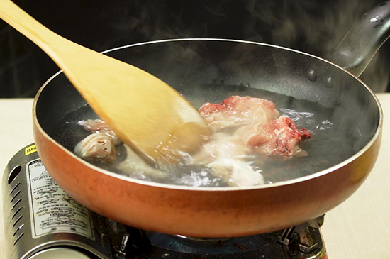 3、切好的鸡肉放入热水内煮几分钟,去除血水后捞出。