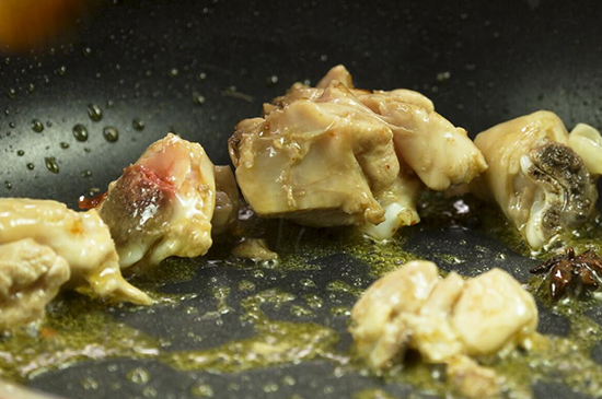 4、起锅烧油,放入姜、蒜、八角、桂皮和豆瓣酱炒出香味,再放入鸡肉翻炒。