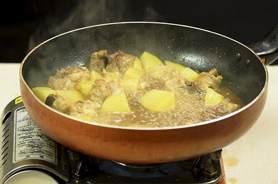 5、鸡肉炒至7分熟后,加入老抽和生抽上色,再倒入清水大火烧开,之后再放入土豆盖锅小火煮15分钟。