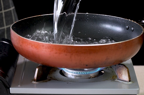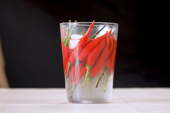 2、起锅烧开水,往里面加入适量盐后放凉。用容器装取适量放凉的盐水后,把风干的朝天椒放入。