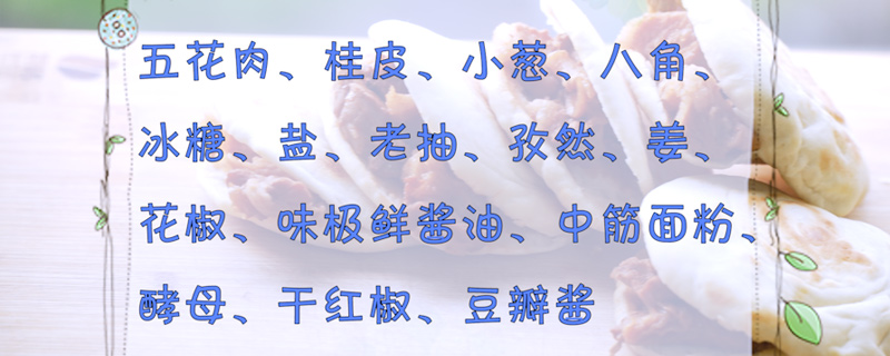 准备食材:五花肉、桂皮、小葱、八角、冰糖、盐、老抽、孜然、姜、花椒、味极鲜酱油、中筋面粉、酵母、干红椒、豆瓣酱。