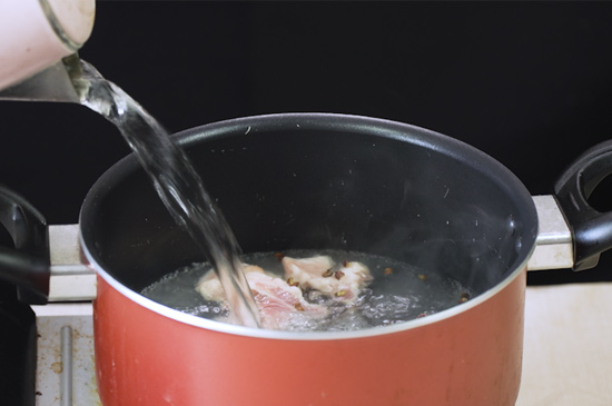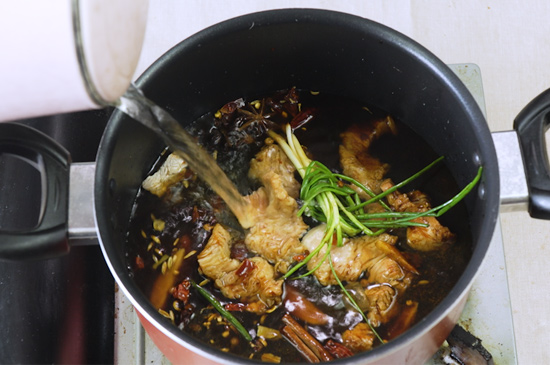 4、加入热水淹过肉面,大火煮开后转中小火慢炖1小时左右,煮至30分钟时放入适量盐。