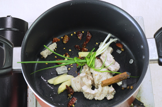 3、把煮好的五花肉捞出重新放入砂锅内,往里面加入姜片、葱结、干辣椒、桂皮、冰糖、八角、孜然、老抽、味极鲜酱油、豆瓣酱,带上一次性手套把它们抓匀。