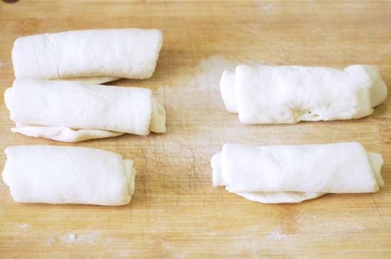 6、把面粉坨擀成长条形,卷起来后静置15分钟左右,再把卷好的面团立起来擀成圆饼状。