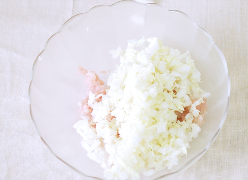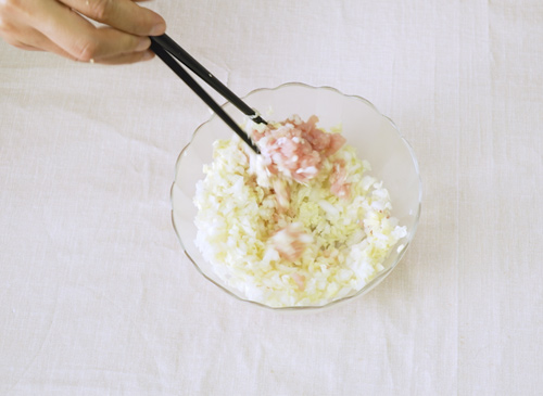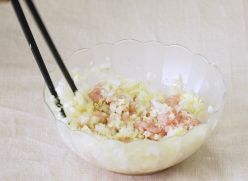 1、将猪肉剁成肉泥,白菜剁碎,放入碗内