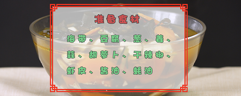 准备食材:海带、豆腐、葱、姜、蒜、胡萝卜、干辣椒、虾皮、酱油、蚝油。