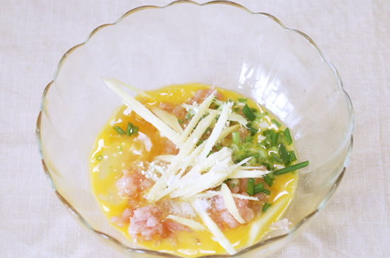 1、鸡蛋打散,猪肉剁成肉馅,葱切成末,姜切成丝备用。