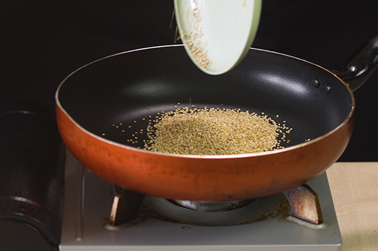 1、起锅烧至5成热后,把白芝麻倒入锅内转小火翻炒。